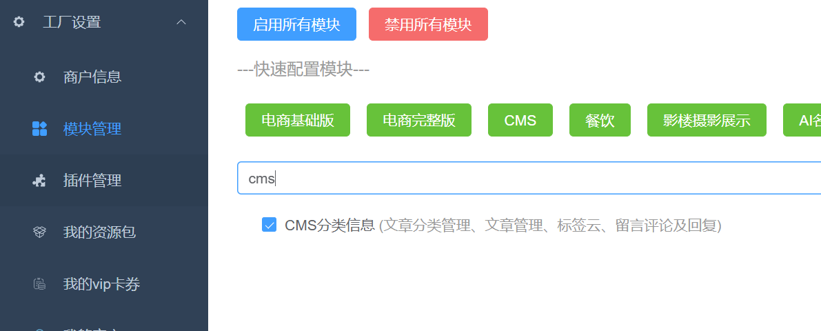 1. 登录后台,左侧菜单 “工厂设置” --> “模块管理” ,启用 “AI名片” 模块,然后退出重新登录后台你将可以看到名片的相关菜单
