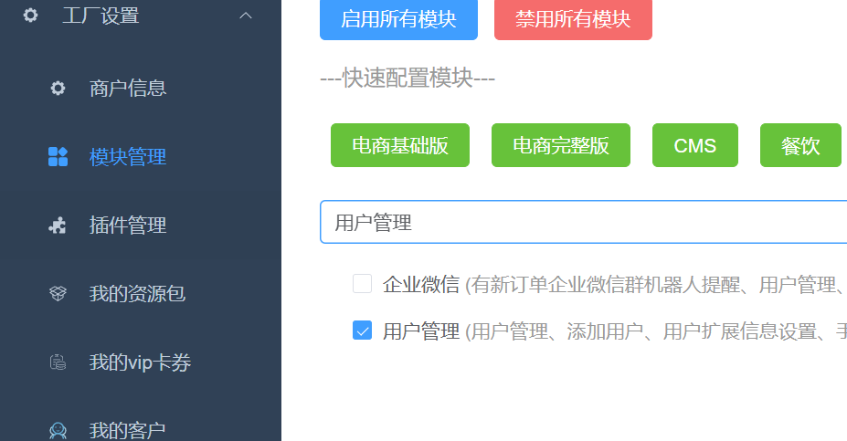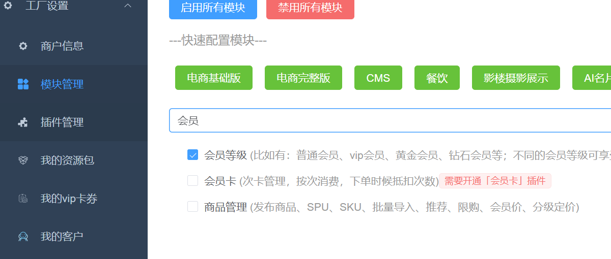 名片管理和访客管理,依托于用户等级 + 用户管理 两个模块,所以也要先启用这两个模块才可以分配: